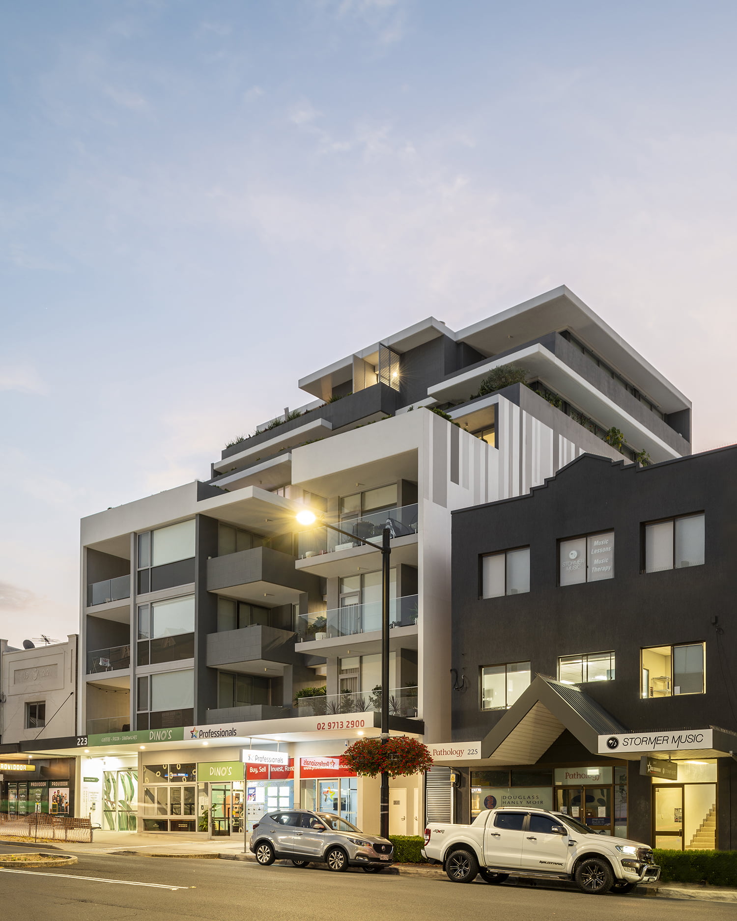 223 Great North Road is a boutique mixed use development comprising of 34 units, a commercial/retail component and two basement car parks. The site has dual frontage towards the residential East Street and the vibrant Great North Road, with an assertive rooftop terrace. Touches of playful colour to the internal facades brighten the central courtyard and provide a lively outlook to the inner facing units.