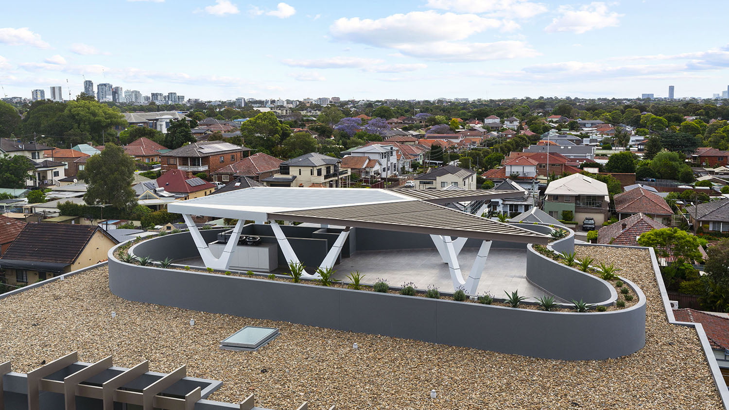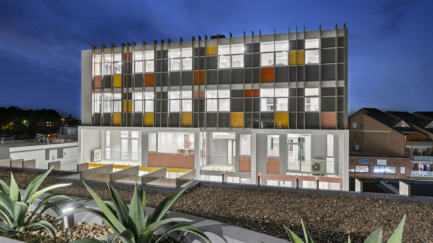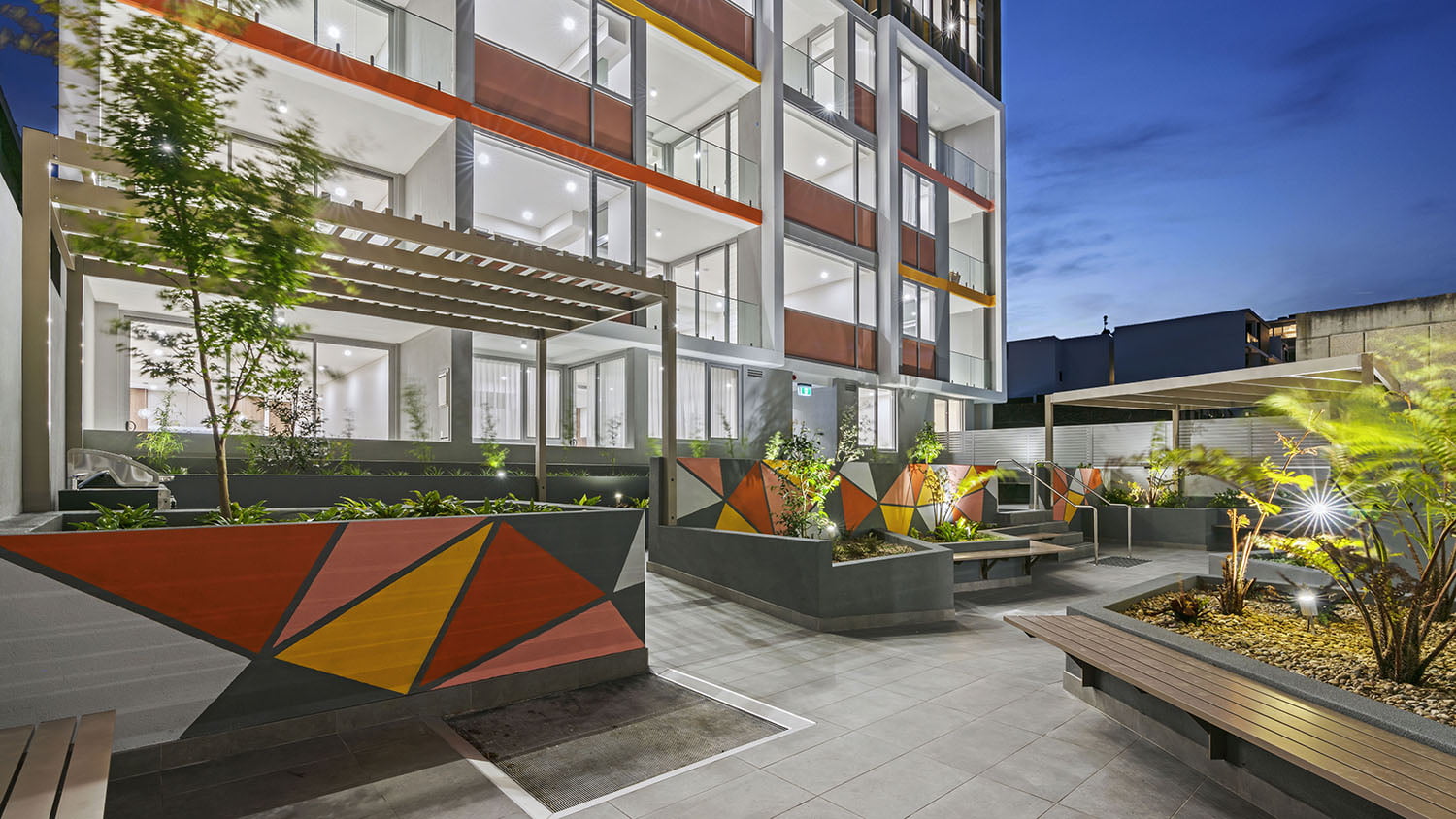 223 Great North Road is a boutique mixed use development comprising of 34 units, a commercial/retail component and two basement car parks. The site has dual frontage towards the residential East Street and the vibrant Great North Road, with an assertive rooftop terrace. Touches of playful colour to the internal facades brighten the central courtyard and provide a lively outlook to the inner facing units.