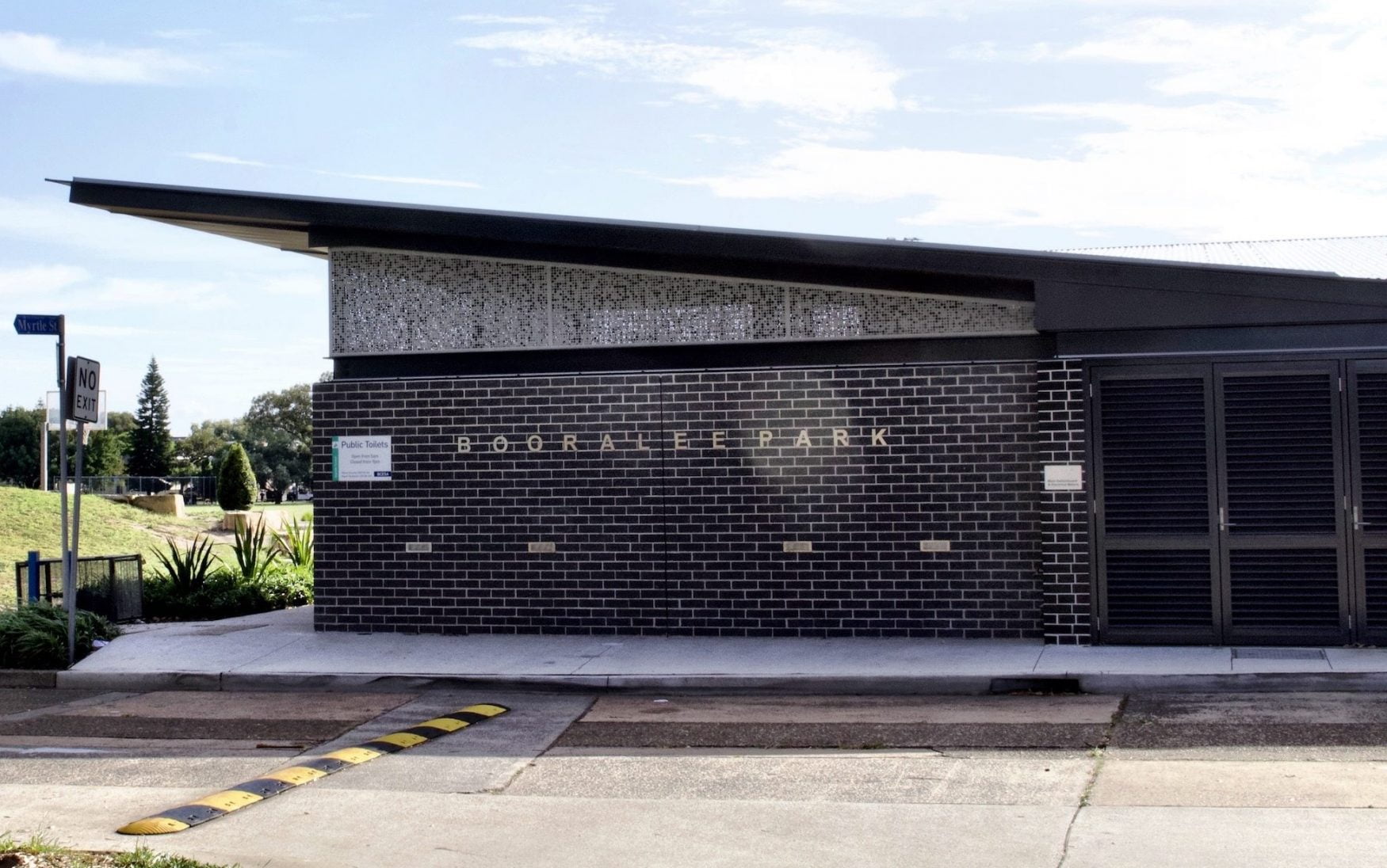 BKA Architecture was tasked with replacing outdated amenities blocks in four sporting fields within the Bayside Council LGA. The first, in Booralee Park, emerges from its context as a striking landmark clad in glazed brick in shades of grey, silver, and black offset by a golden yellow. Topped with a sculptural sailing roof lined with composite timber, the building offers accessible public amenities in addition to a canteen and storage space.