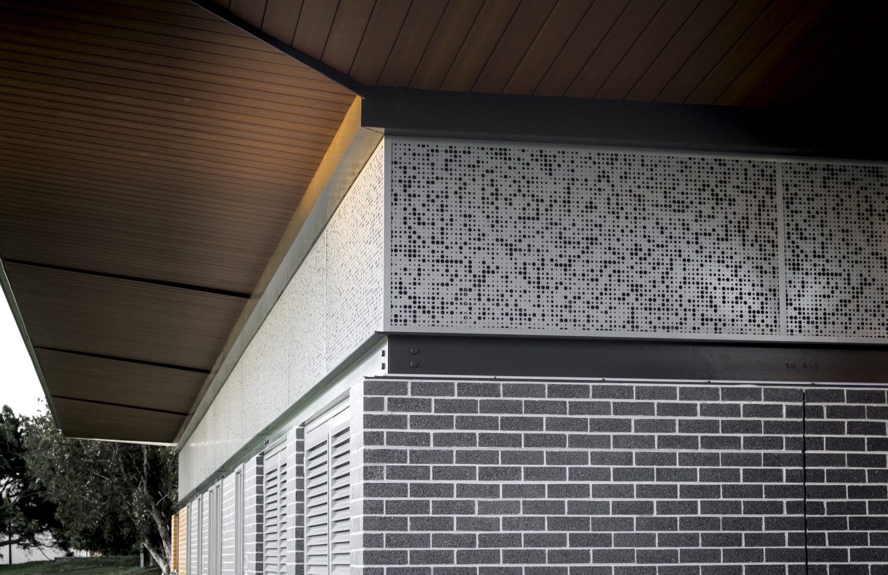 Rockdale Park Amenities Building features an expressive roof form extending towards the new playground and water feature pools of the park. Material selection of perforated steel for the ceiling creates organic patterns alluding to natural elements. A colour palette consisting of green, blue and brown for the bricks reflects the natural context of the park.