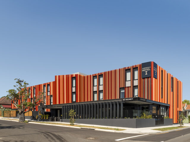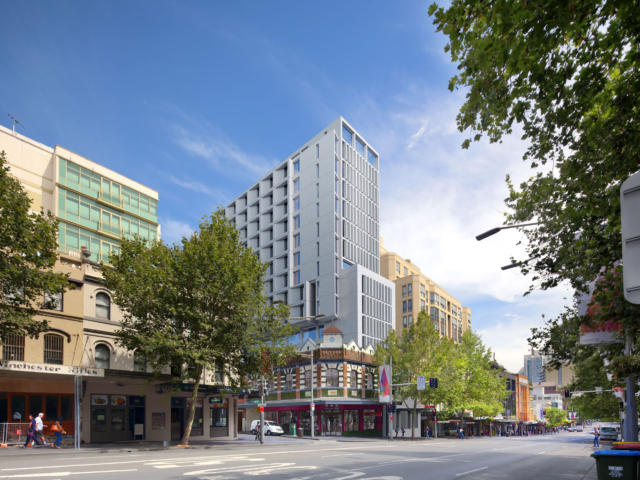 Spread across 8 storeys, this 4-star hotel on O’Riordan Street, Waterloo will house 142 hotel rooms, ground floor reception, vehicular entry, a restaurant, and outdoor dining areas. These features will be contained within a sleek, contemporary building envelope and be complemented by conference and gymnasium facilities as well as internal courtyards with podium landscaping. The west facade rooms to Oriordan street are shaded with coloured steel screens.