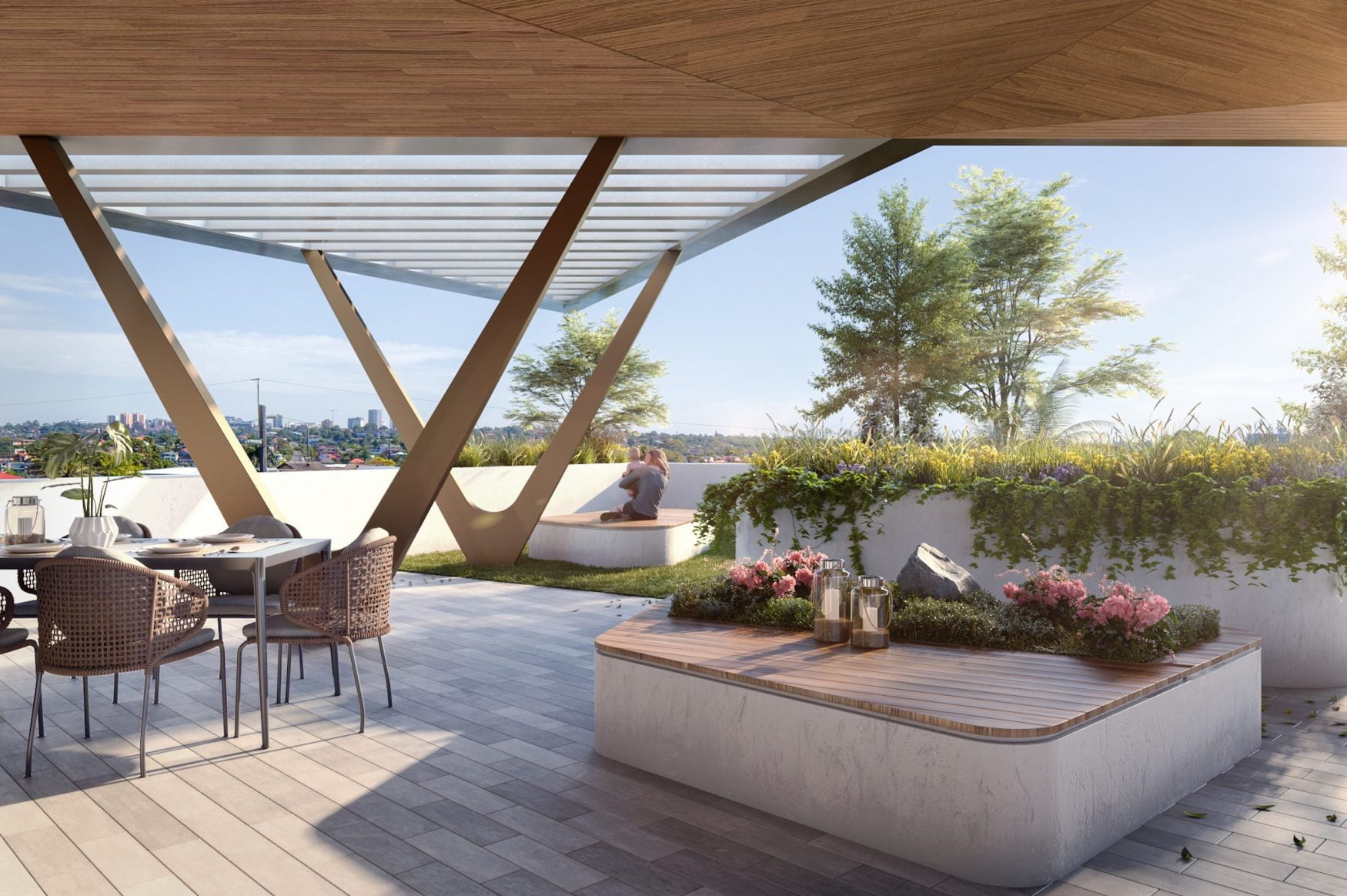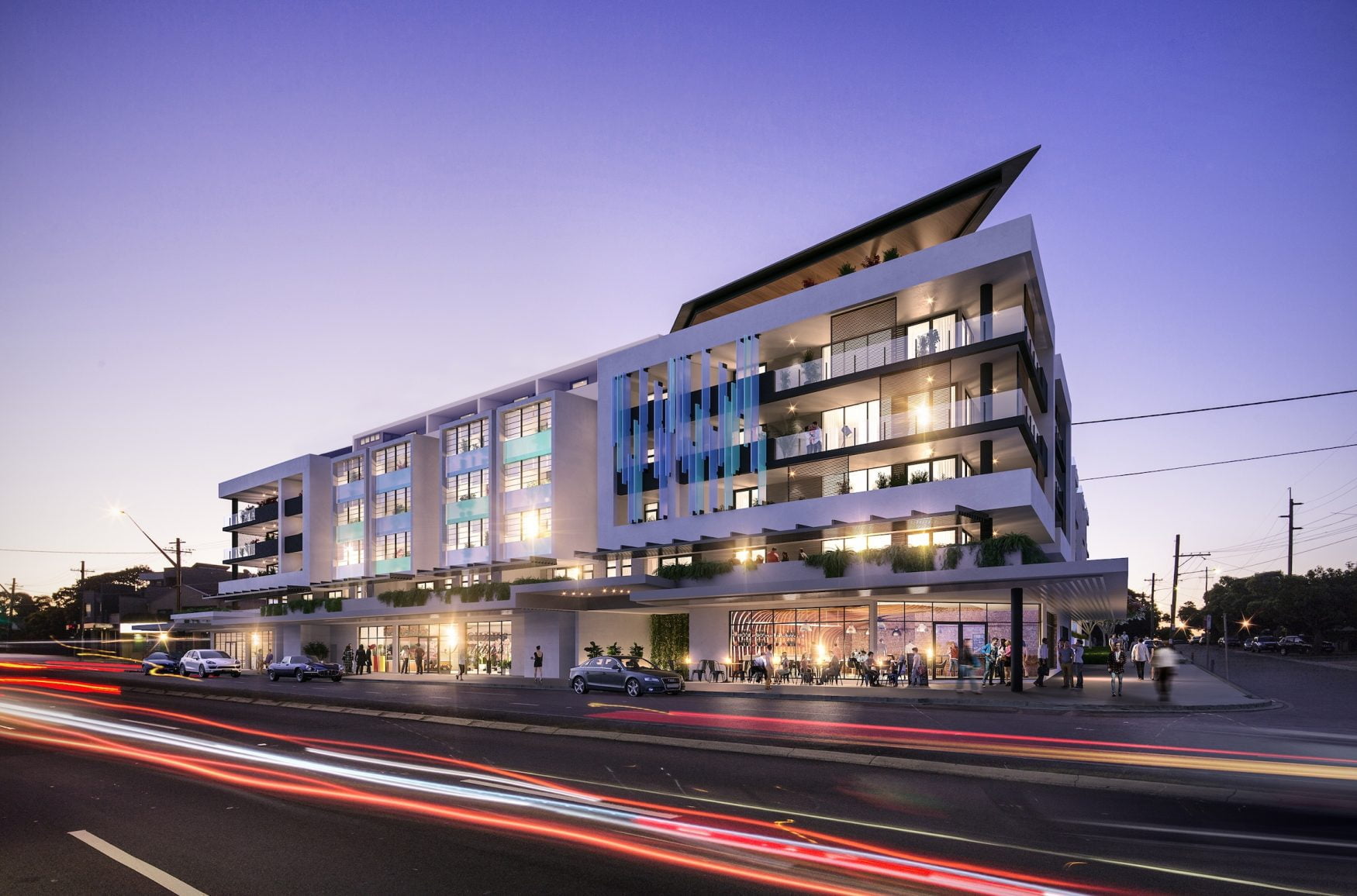 Located on a major arterial road in Sans Souci, in Sydney’s South, this 5-storey mixed-use development combines high amenity apartments with ground floor commercial space. On the upper levels, three streamlined forms comprising a combination of 1, 2, and 3 bedroom apartments are arranged in a horseshoe shape that maximises daylight penetration and ventilation in each apartment. A landscaped courtyard garden at the centre of this horseshoe configuration provides sheltered communal space for residents, while an active rooftop encourages community interaction and outdoor recreation.