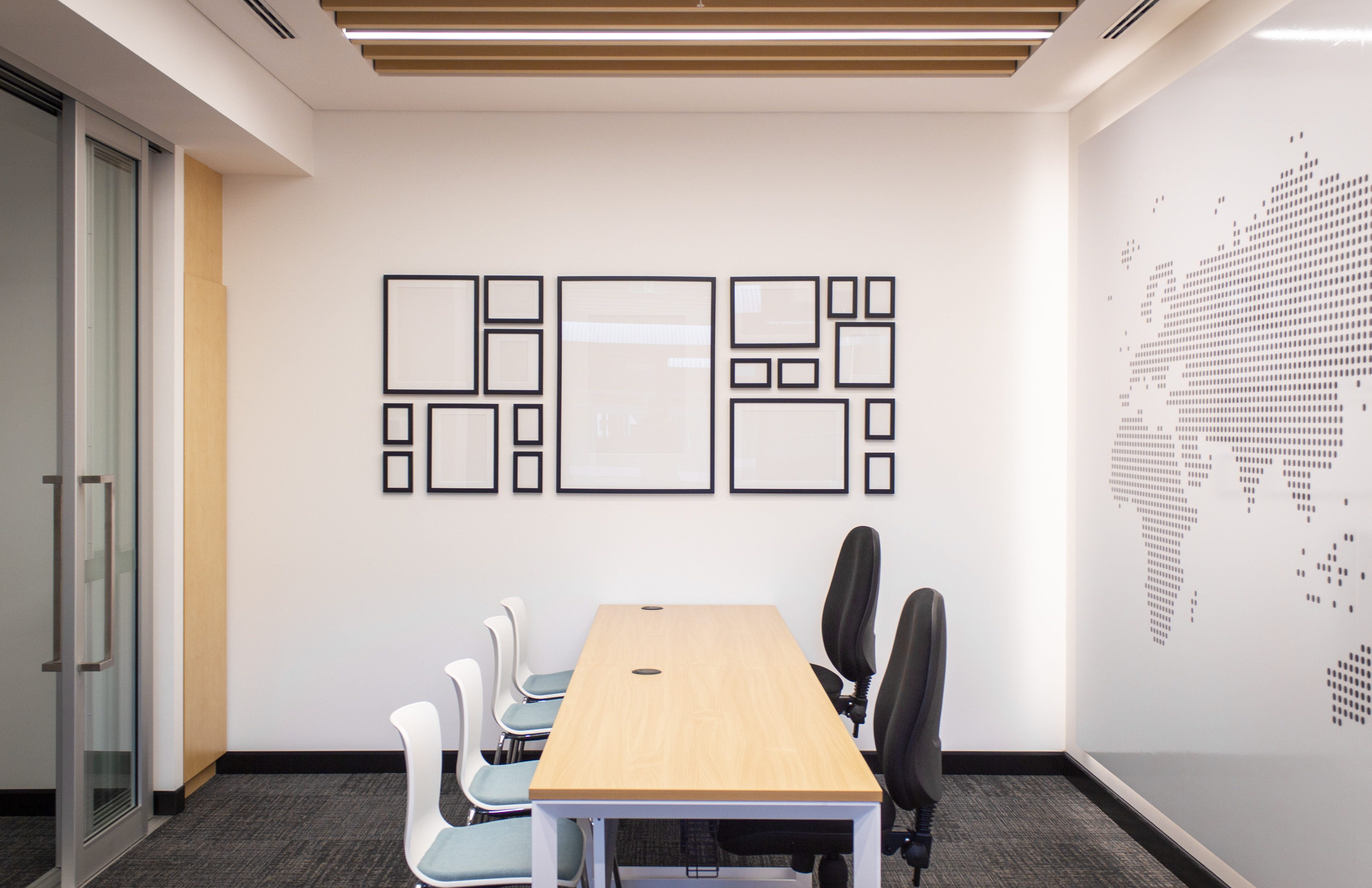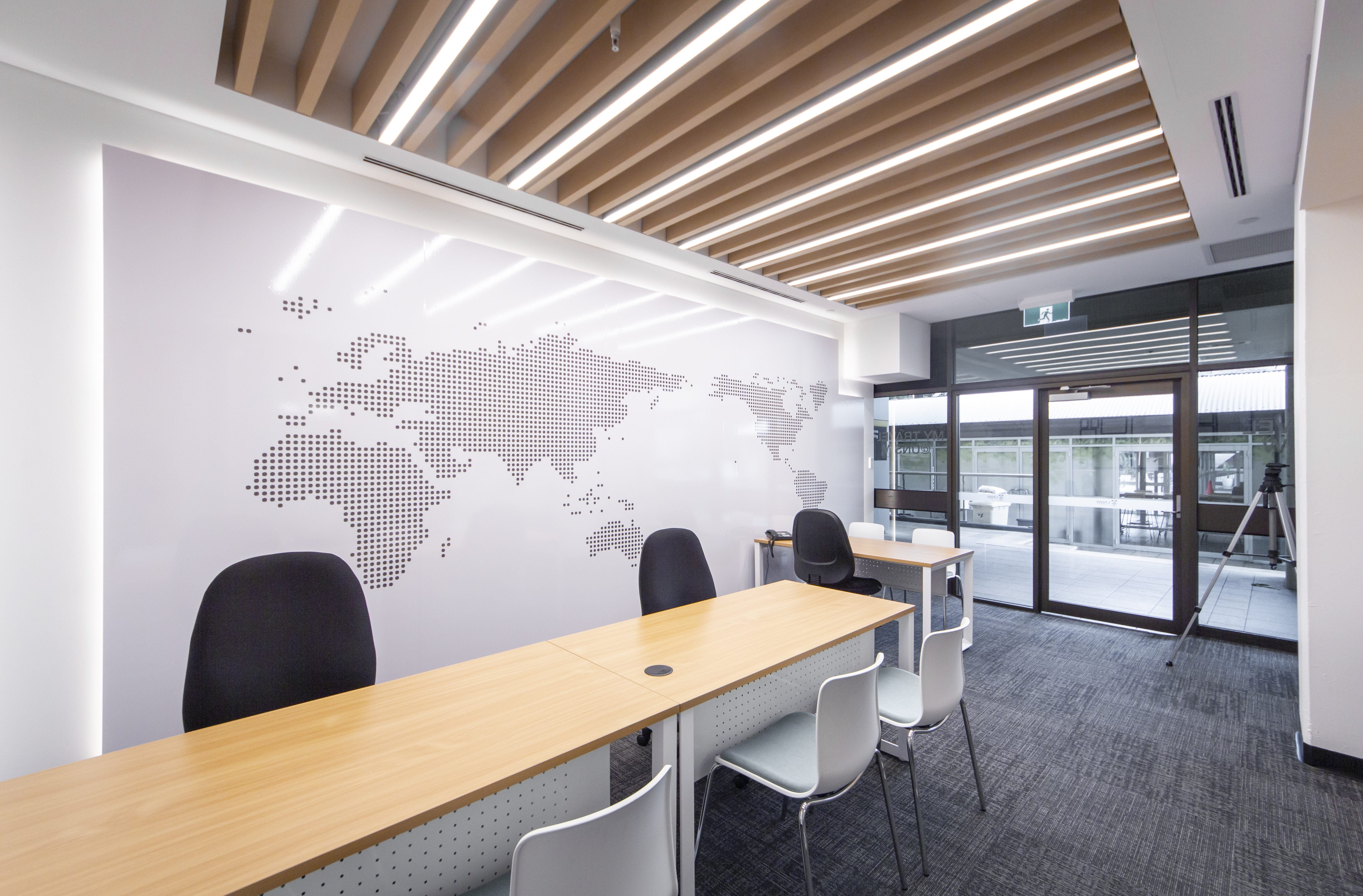 Home to UNSW’s travel program, the Travel Office is a work and research space on the University’s Kensington campus. Comprising a flexible office space and meeting room, it facilitates student preparation for university related trips and postgraduate fieldwork research. In the main office space, a large world map decal doubles as a whiteboard, allowing students to be placed on the board while they are away, while in the meeting room a screen and AV capabilities allow interaction with researchers located overseas.