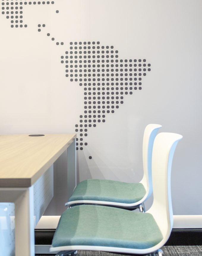 In keeping with its function, design elements within the Travel Office respond creatively to the themes of travel and global connections. A restrained material palette of timber, metal, and glass is complemented by wall decals that include two novel variations on the world map: a stylised dot matrix version in the main office space and a text-based graphic in the meeting room in which the names of major cities are arranged to form countries and continents.