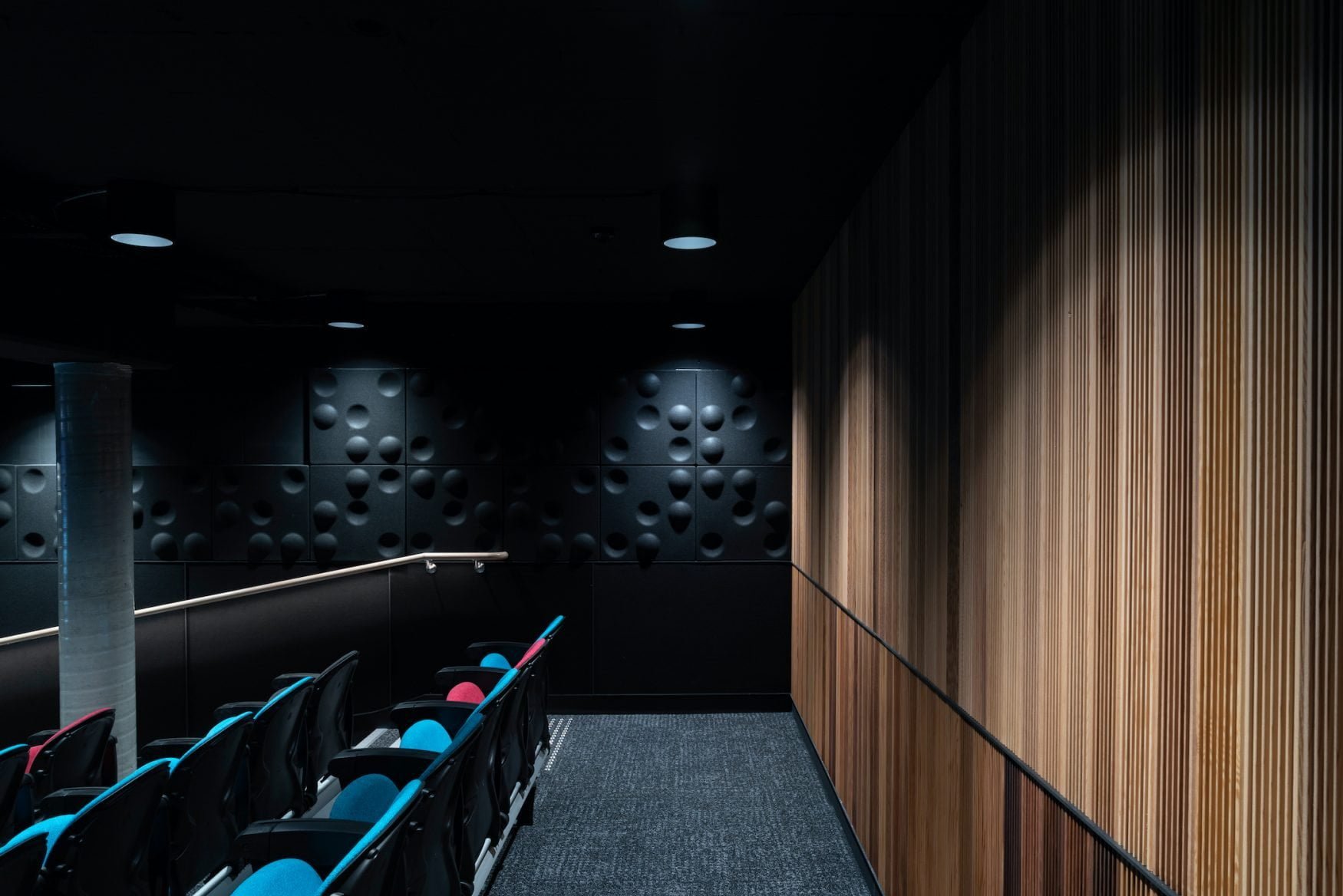 BKA is excited to have completed a lecture theatre refurbishment on UNSW’s Paddington campus. The project was focussed on developing an excellent solution to acoustics whilst achieving unique and youthful visual aesthetics. The space features wall panels and ceiling clouds that dramatically improve acoustic qualities, alongside colourful seats. This creates a vibrant atmosphere that is flexible and perfectly suits contemporary learning and teaching.