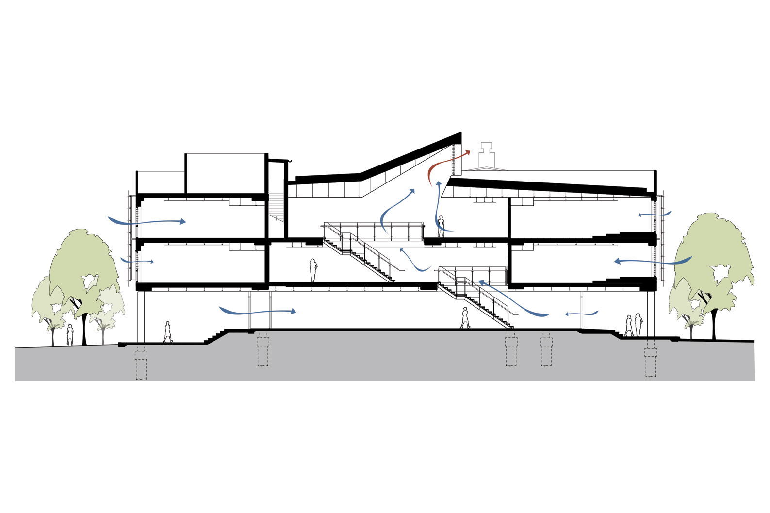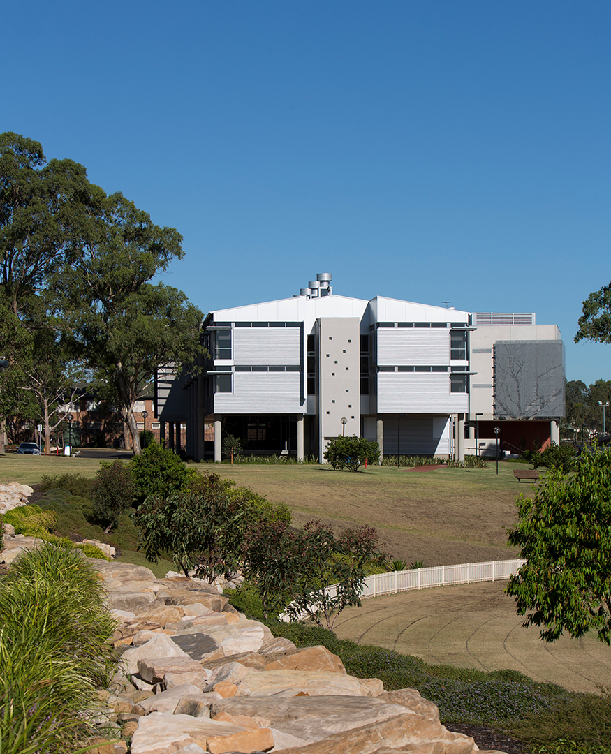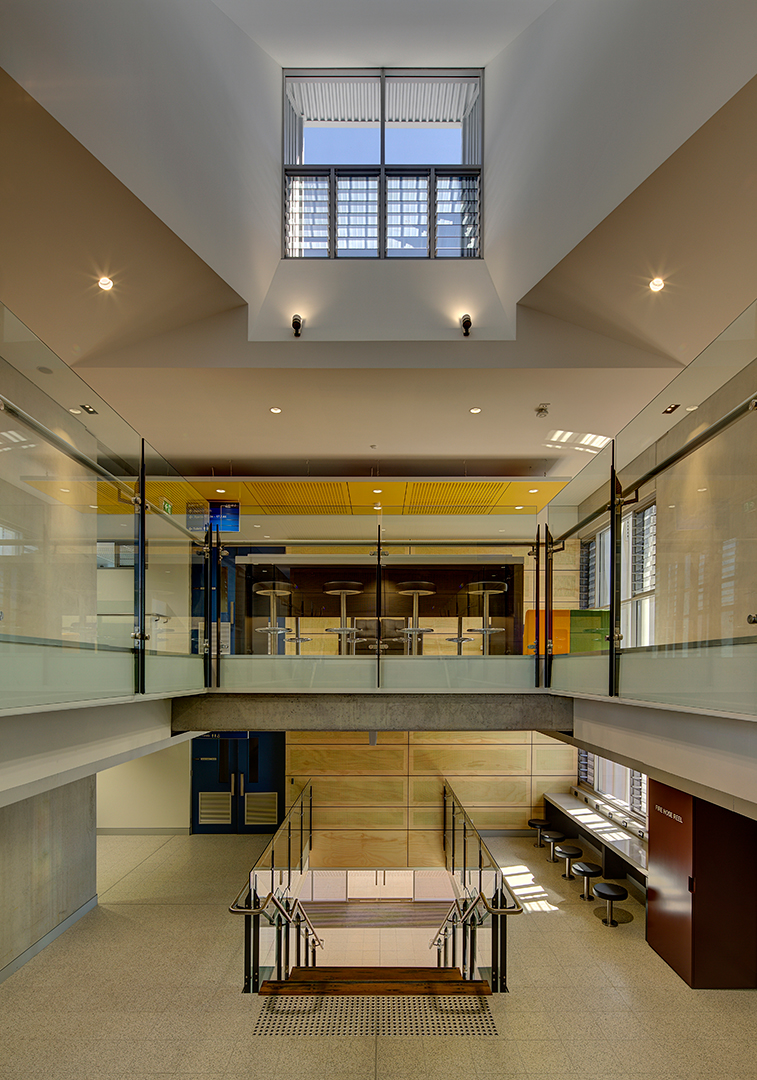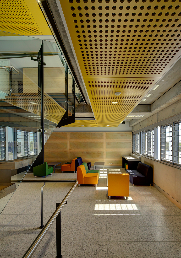 This 5 Star Green Star-designed teaching facility on WSU’s Bankstown campus takes a progressive approach to sustainability and education design. Organised in two 3-storey wings that intersect at a full-height public core, the facility incorporates future-focused elements including flexible learning spaces, Iaboratories, studio spaces, a lecture theatre and integrated ICT. Complementing this is a range of sustainability measures including a BMS mixed-mode integrated ventilation system, night flushing via automated louvres, and public spaces ventilated naturally through the stack effect.
