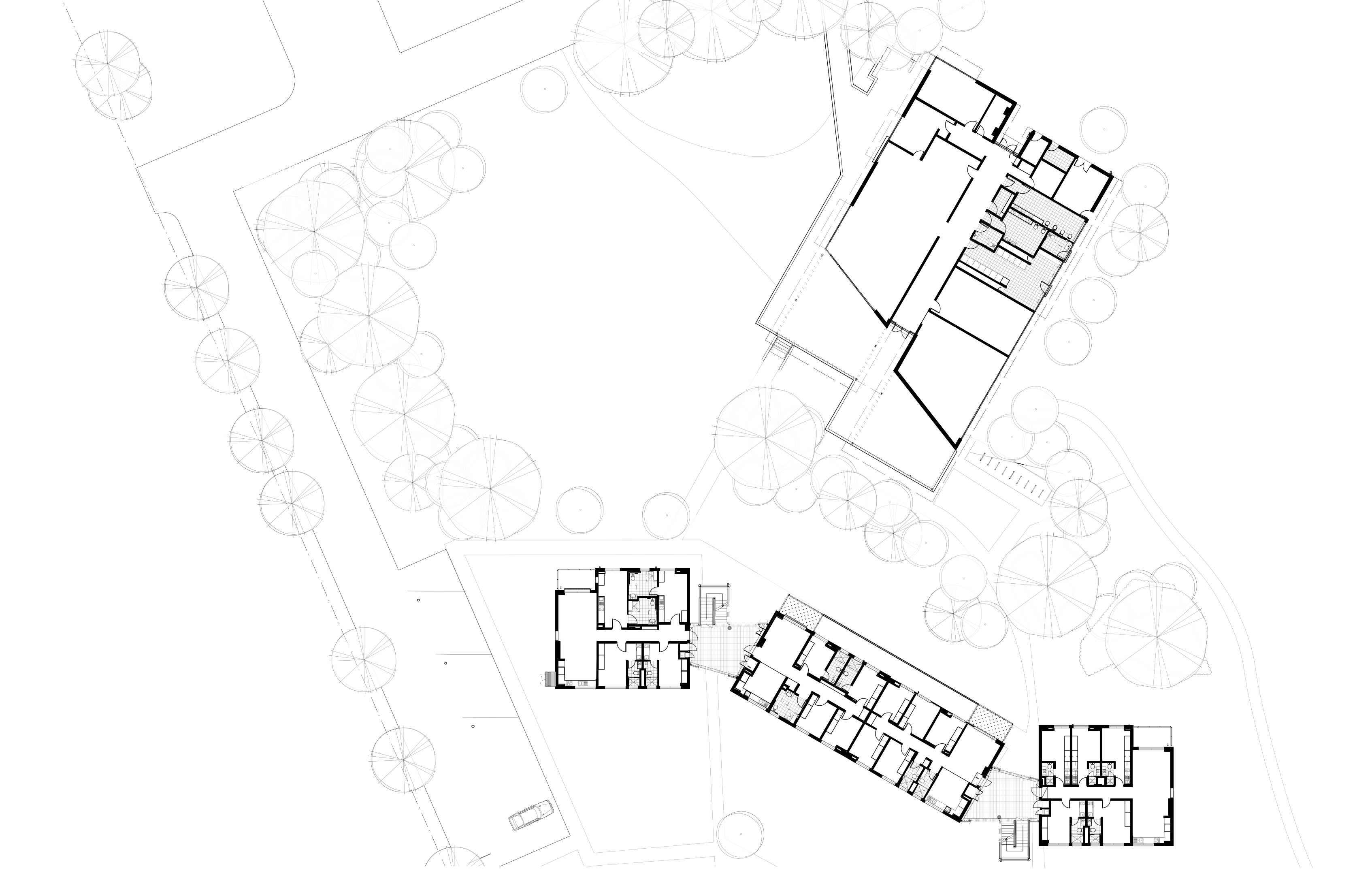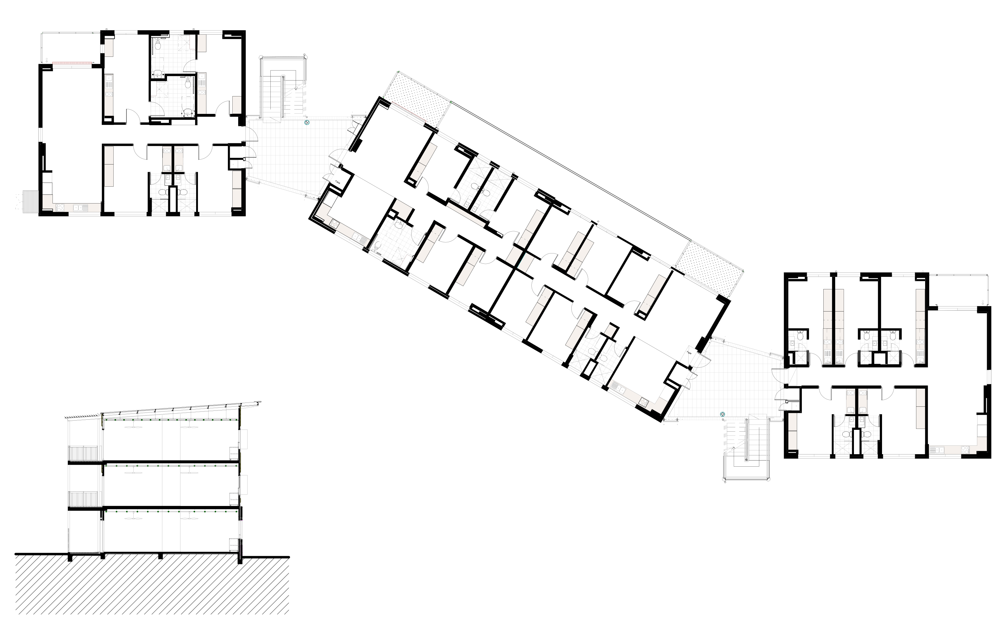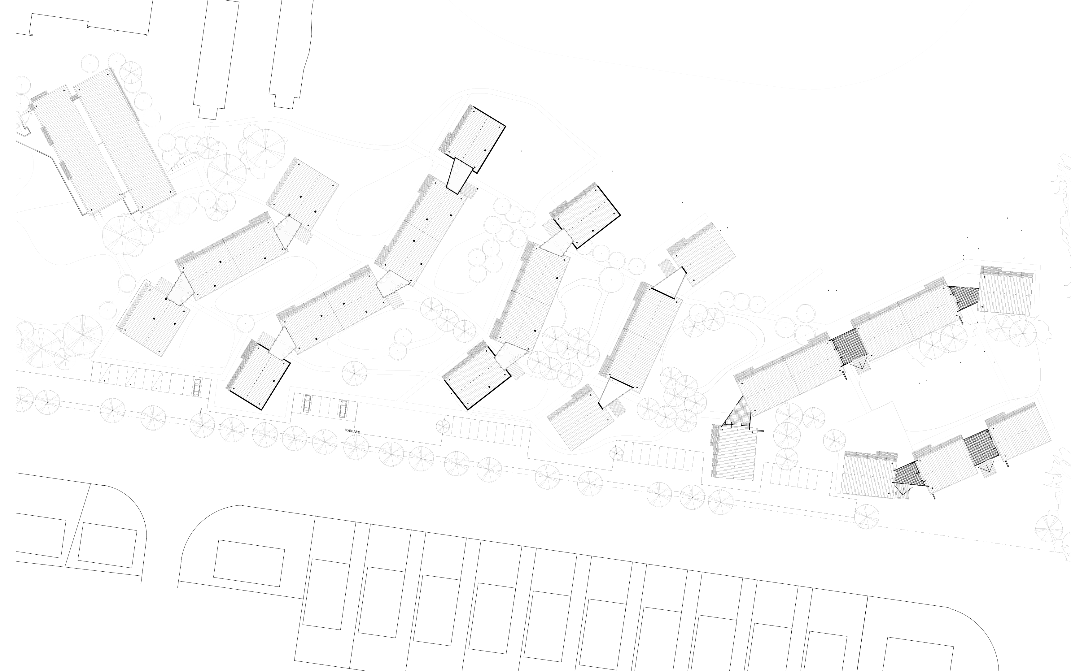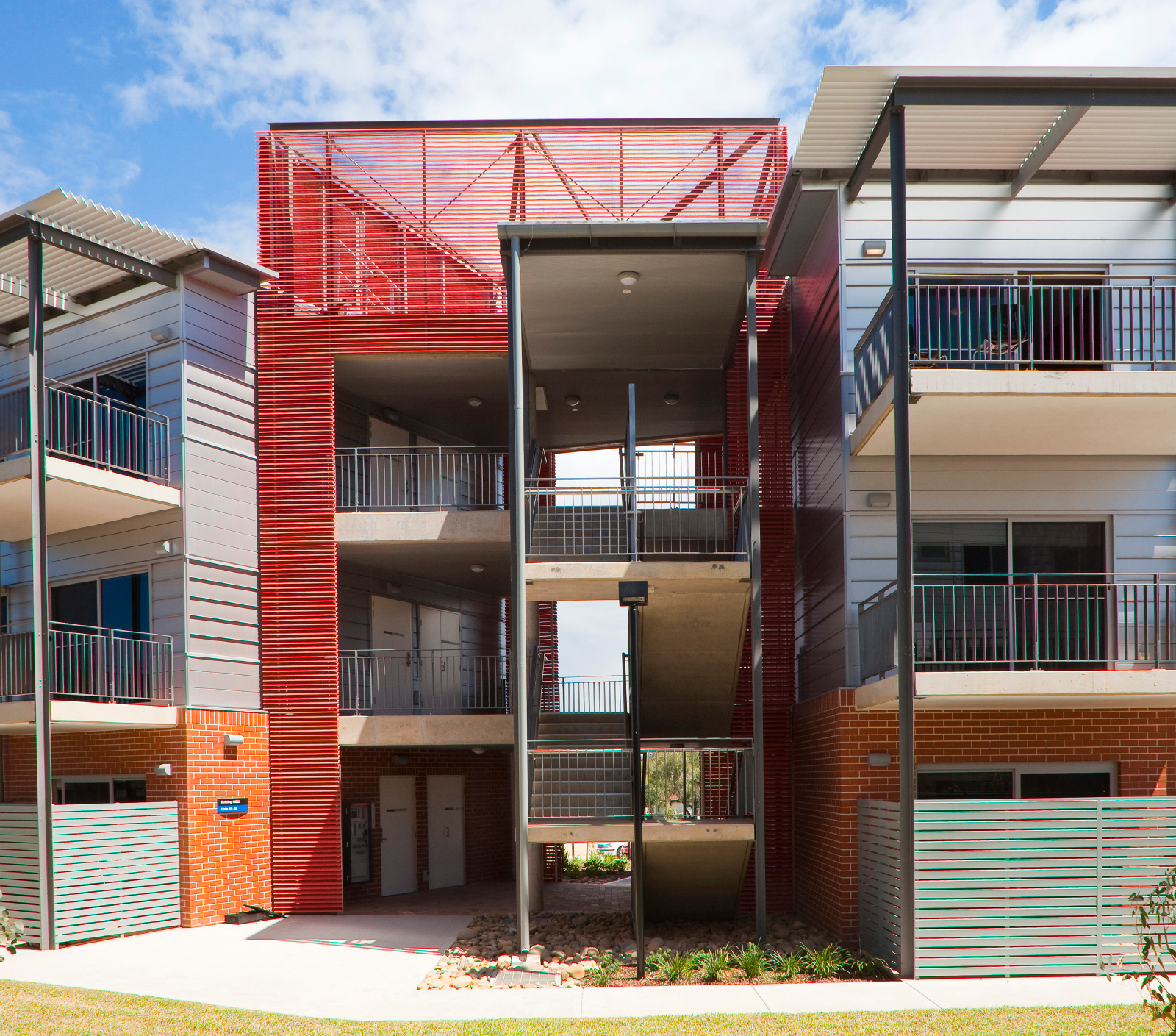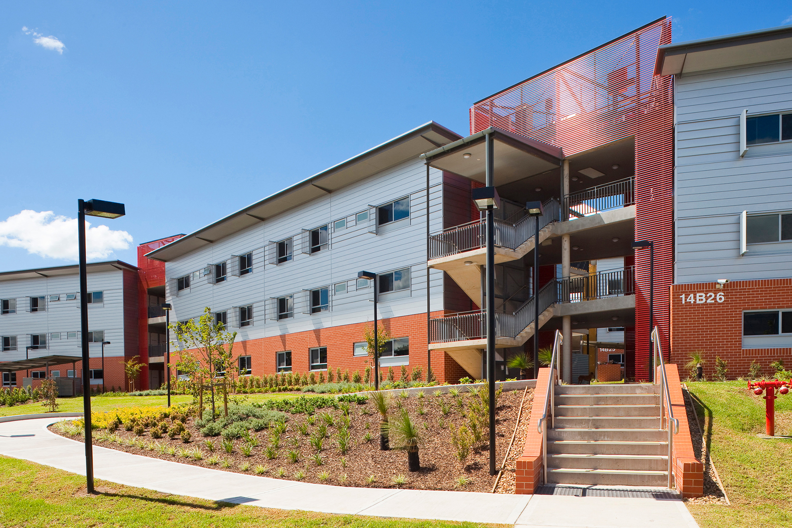 Offering 400 beds, breakout spaces, and common facilities, this project balances amenity with a sensitive response to its natural surroundings. Low-lying, 3-storey buildings emerge from landscaped courtyards and incorporate either a 5-bedroom apartment or cluster of 5 studios to suit different living arrangements. DIfferentiated by coloured louvres that conceal rooftop services, the buildings are united by a sweeping village green providing views of, and transitioning into, the broader campus.