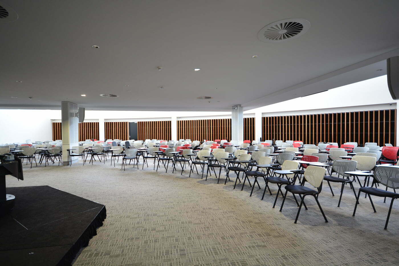 The hub also incorporates a 300-seat lecture hall with amphitheater-like arrangement that maximises acoustics, seating, and visual presentation. A newly established Learning Commons area challenges the rigidity of the traditional study environment, and instead fosters collaborative learning through a combination of open groups and casual solo study spaces.