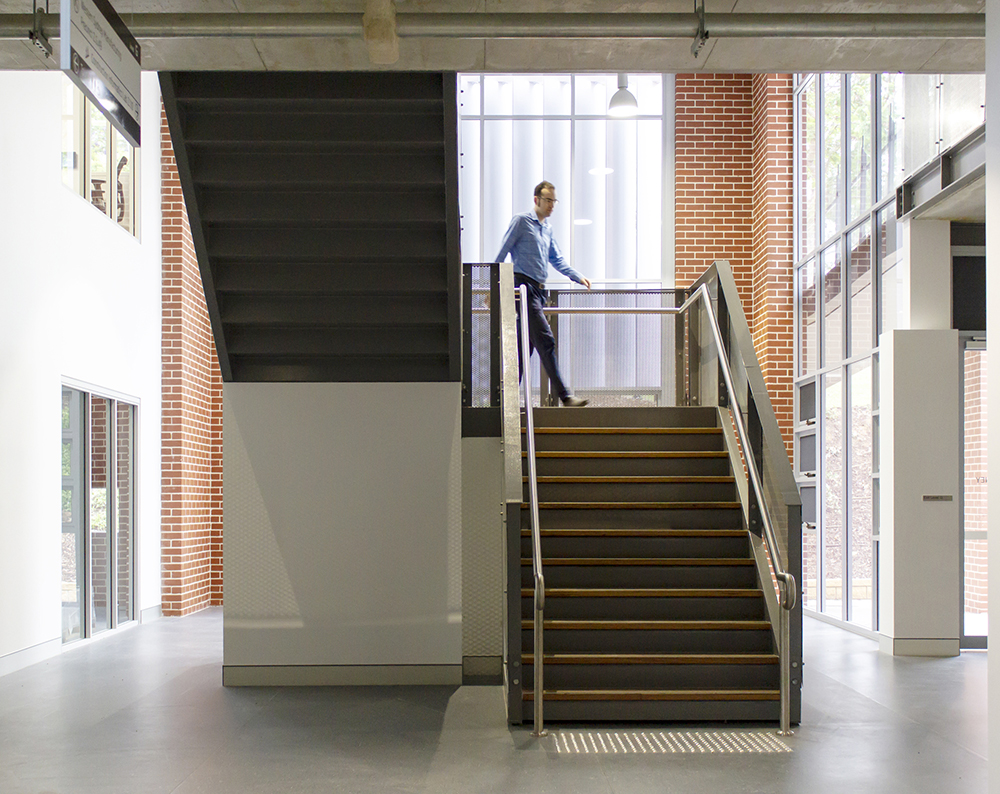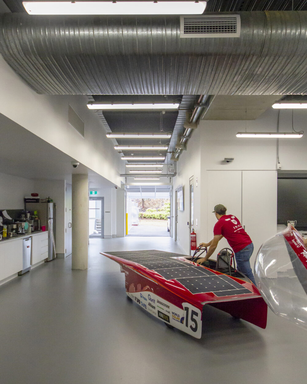 Ancillary spaces within the new 2-storey building are designed to support teaching and learning functions and integrate space for meetings, collaboration, and display. Additionally, the project incorporates a number of unconventional spaces including a Solar Car and Formula SAE (Society of Automotive Engineers) project area and associated project office, virtual reality and BIM lab, prototype display room, Sustainable Construction Research Hub, PhD project room, and meeting rooms.
