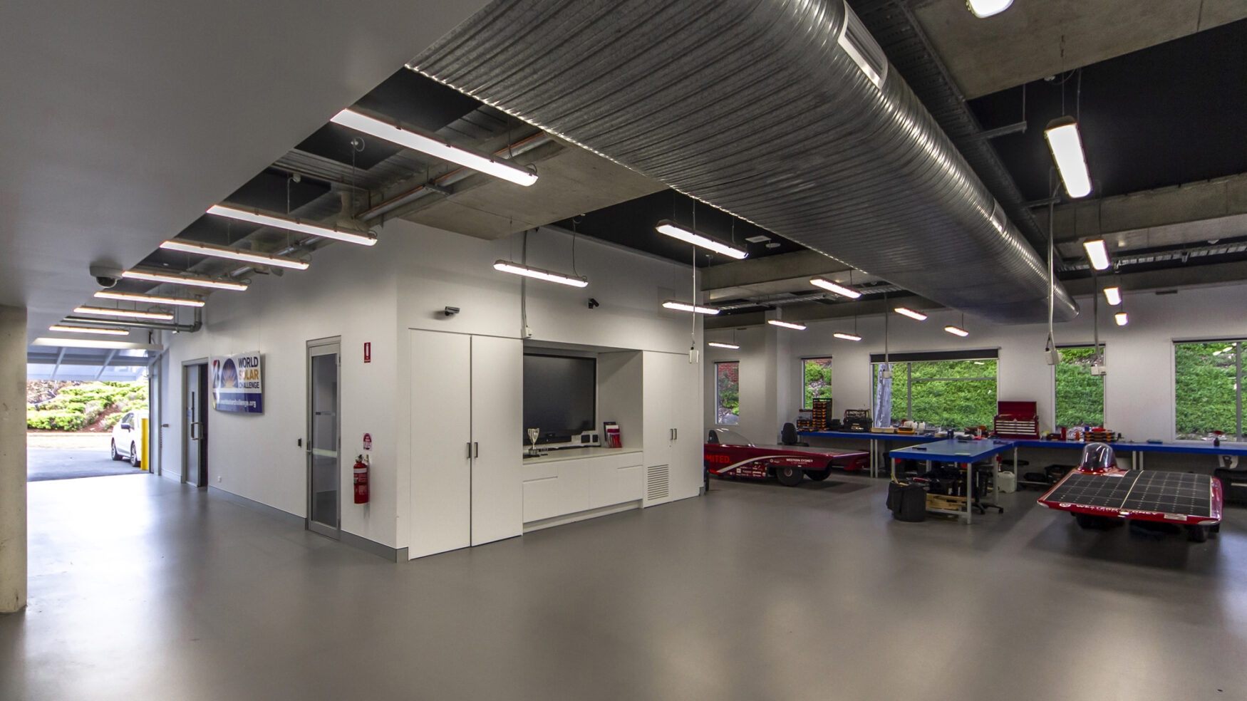 Ancillary spaces within the new 2-storey building are designed to support teaching and learning functions and integrate space for meetings, collaboration, and display. Additionally, the project incorporates a number of unconventional spaces including a Solar Car and Formula SAE (Society of Automotive Engineers) project area and associated project office, virtual reality and BIM lab, prototype display room, Sustainable Construction Research Hub, PhD project room, and meeting rooms.